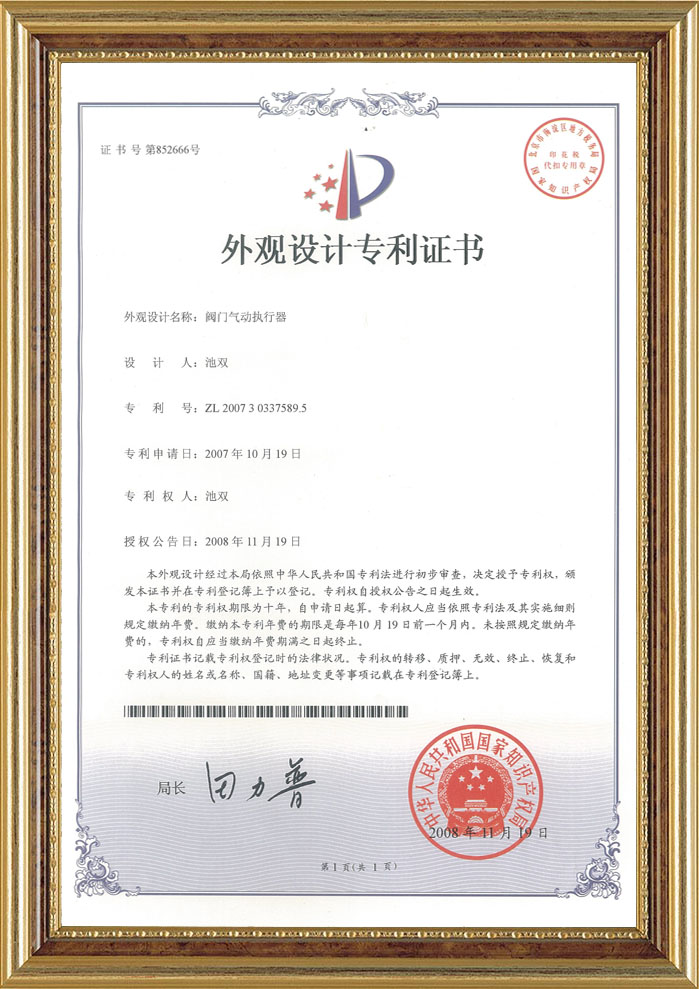 閥門(mén)氣動(dòng)執(zhí)行器專(zhuān)利證書(shū)