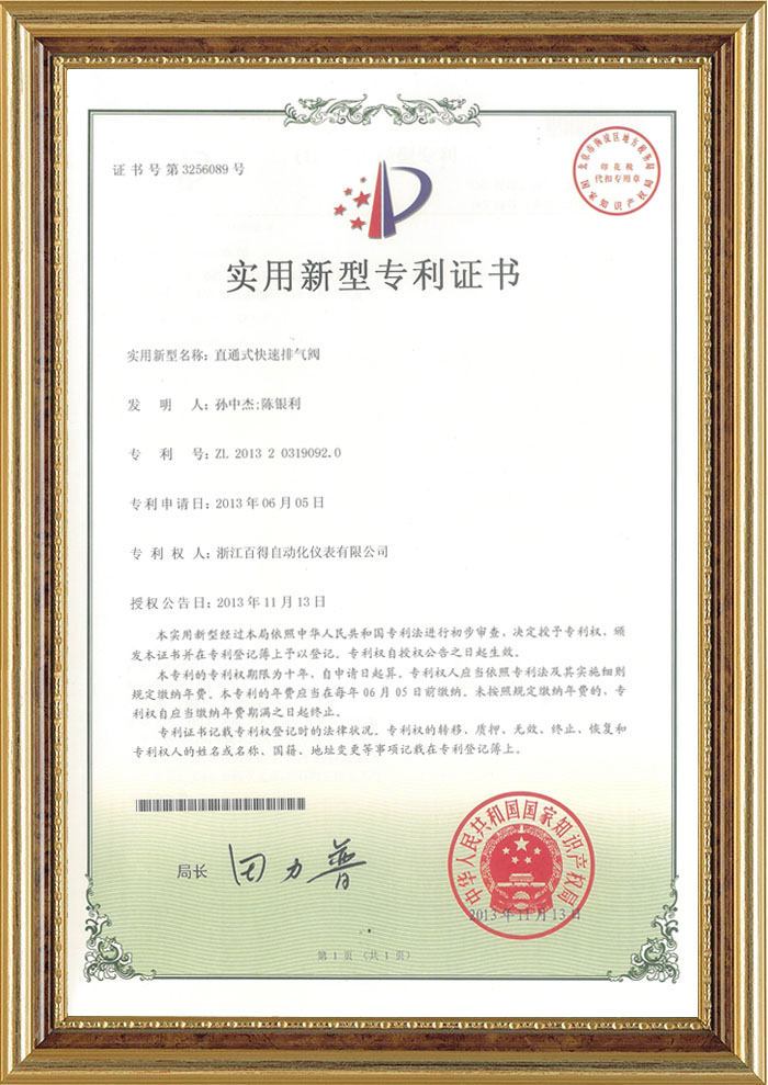 直通式快速排氣閥(氣動(dòng)執(zhí)行器)專(zhuān)利證書(shū)